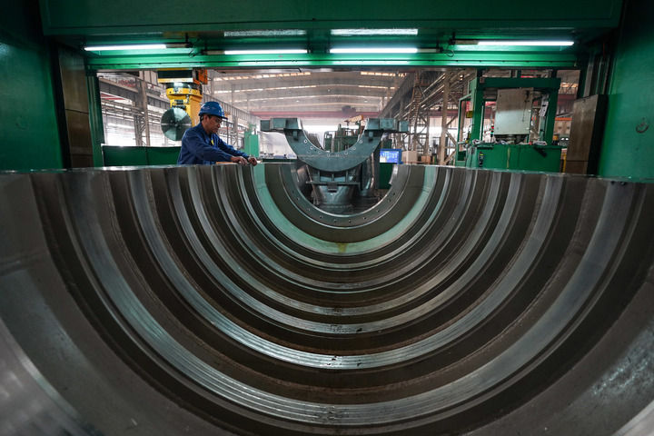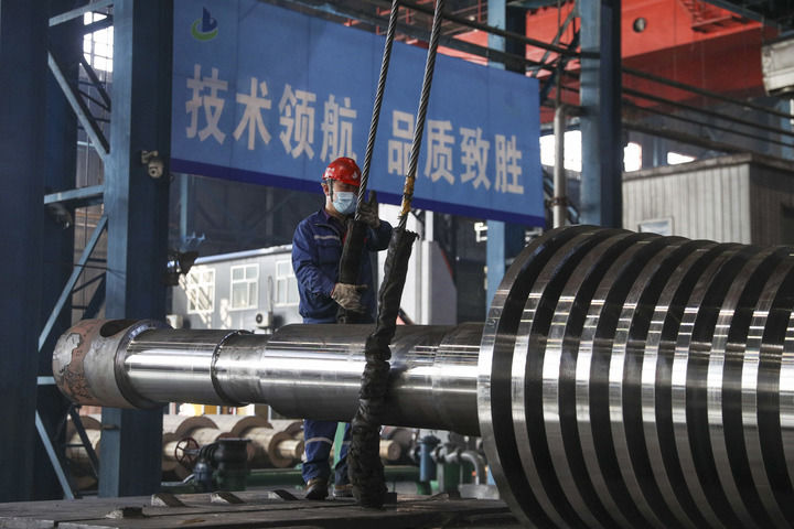 工人在位于黑龍江省齊齊哈爾市的中國(guó)一重集團(tuán)有限公司生產(chǎn)車間運(yùn)送產(chǎn)品(2024年3月5日攝)。