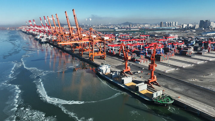 貨船在遼寧營(yíng)口港碼頭裝運(yùn)糧食(2024年1月10日攝,無(wú)人機(jī)照片)。