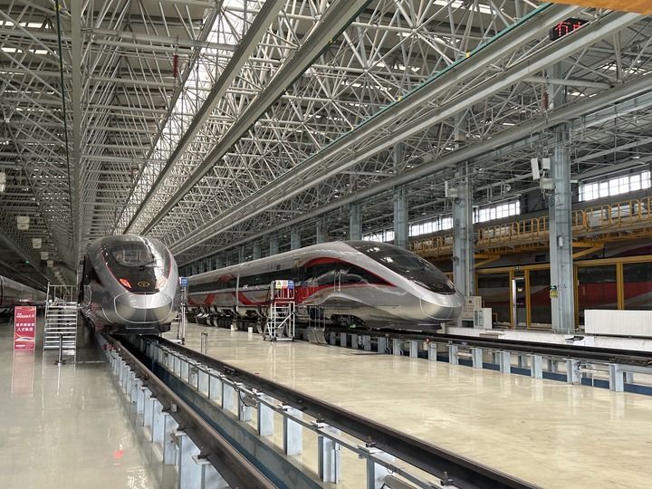 在中車長(zhǎng)客國(guó)鐵事業(yè)部制造中心拍攝的復(fù)興號(hào)智能動(dòng)車組(2024年7月17日攝)。
