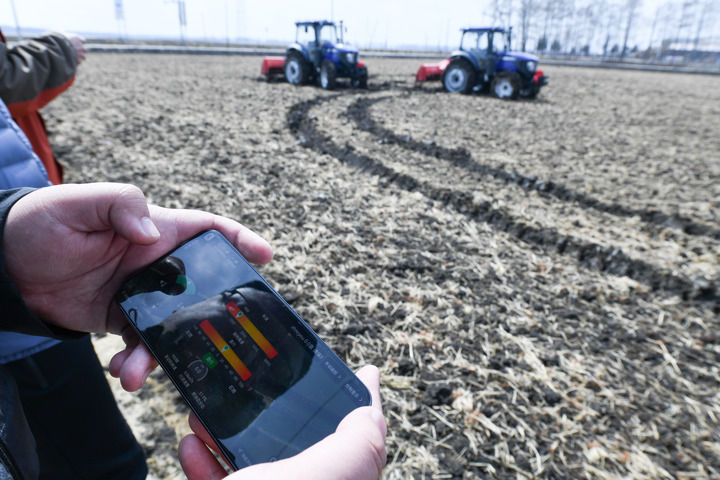 在黑龍江北大荒農(nóng)業(yè)股份有限公司友誼分公司智慧農(nóng)場(chǎng)的地塊內(nèi),技術(shù)人員操作兩輛拖拉機(jī)進(jìn)行無(wú)人駕駛測(cè)試(2024年4月3日攝)。