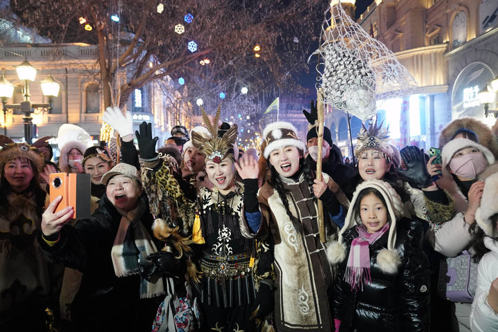 身著赫哲族服飾的赫哲族群眾和饒河縣文旅推薦官在哈爾濱中央大街與游客互動(dòng)(2024年1月6日攝)。