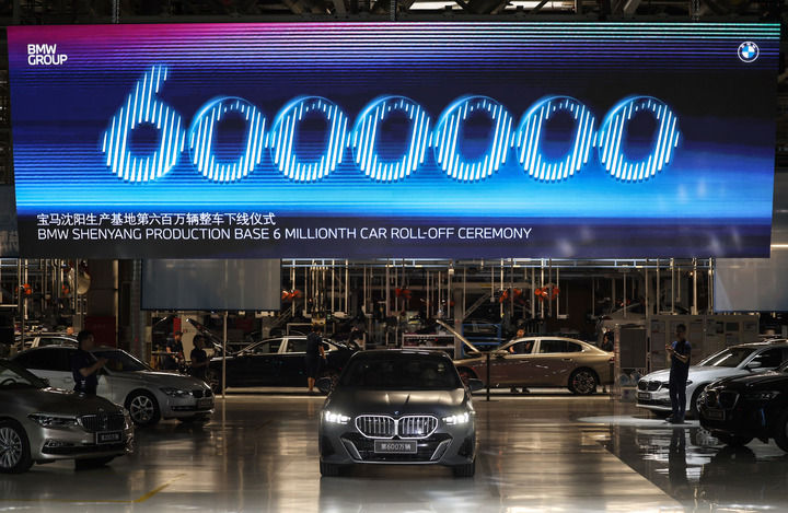 在寶馬沈陽(yáng)生產(chǎn)基地拍攝的華晨寶馬第600萬(wàn)輛整車下線儀式(2024年5月8日攝)。