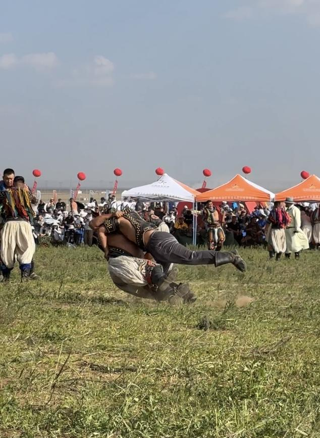 阿斯琴:包括腰力、轉(zhuǎn)動能力和手臂的力量。(牧民的傳統(tǒng))馴馬、馴牛、馴駱駝,不能用蠻力,要有巧勁,要有這方面的天賦才行。比賽規(guī)則就是單排淘汰,倒了就不能再上了。一跤定勝負(fù),這是它摔跤的特點。
