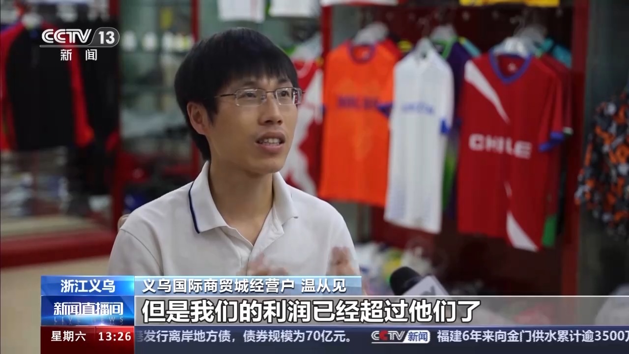 溫從見是義烏國際商貿(mào)城的一位經(jīng)營戶,從事球衣服裝行業(yè)已經(jīng)17年,經(jīng)歷了多輪體育賽事的備貨、生產(chǎn)和銷售。得益于敏銳的反應(yīng)力和良好的適應(yīng)力,溫從見在今年大賽期間收益頗豐。