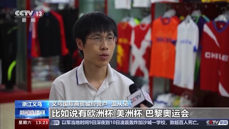 義烏國際商貿(mào)城經(jīng)營戶 溫從見:今年因為是世界大賽年,比如說有歐洲杯、美洲杯、巴黎奧運會,差不多3月份開始,我們就已經(jīng)著手開始接單、打樣、生產(chǎn)這一系列的運動服飾。我們總共3個賽事下來銷了30萬件左右。