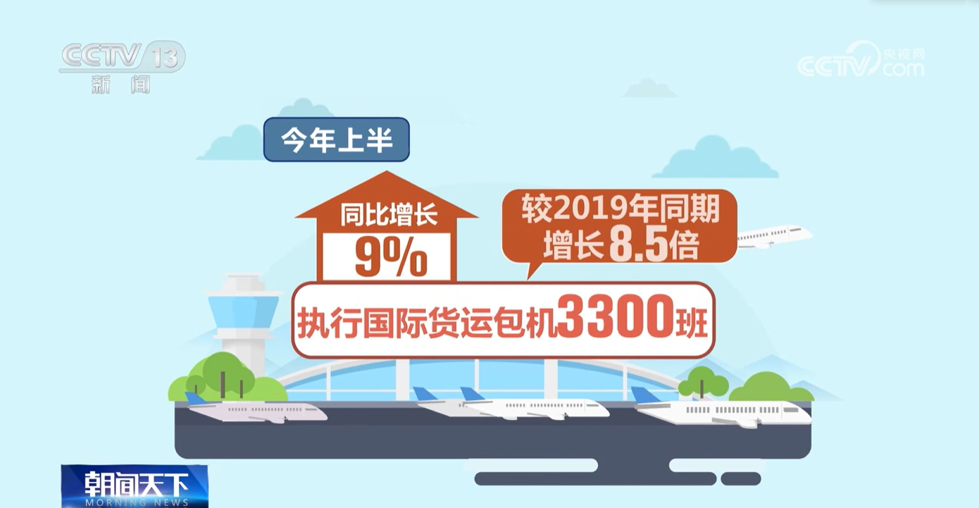 為適應跨境電商、電動汽車、鋰電池和光伏產(chǎn)品“新三樣”等貨物運輸?shù)臅r效性、靈活性要求,國際貨運不定期航班量也保持增長的趨勢。今年上半年執(zhí)行國際貨運包機3300班,同比增長9%,較2019年同期增長8.5倍。