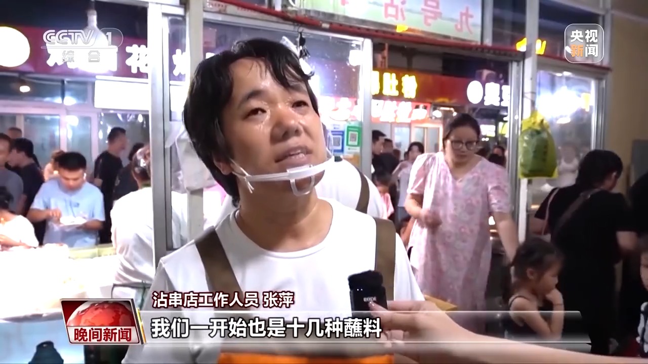 夜幕降臨、高溫消散,山西太原食品街就迎來大批食客。食品街的一家沾串店面積不大,食客只能站著吃,但卻吸引大批食客光顧。沾串食材是熟的,食客蘸上各個口味的醬料就能直接開吃。