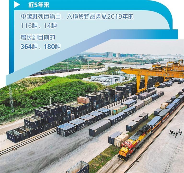 數(shù)據(jù)表明,高效、實(shí)惠、便捷的中越班列已得到市場(chǎng)認(rèn)可。近5年來(lái),中越班列運(yùn)輸出、入境貨物品類(lèi)從2019年的116種、14種,增長(zhǎng)到目前的364種、180種。中越班列集貨地已覆蓋廣西及周邊省份20多個(gè)地市,跨境貨物運(yùn)輸覆蓋越南、老撾、泰國(guó)等多個(gè)東盟國(guó)家。