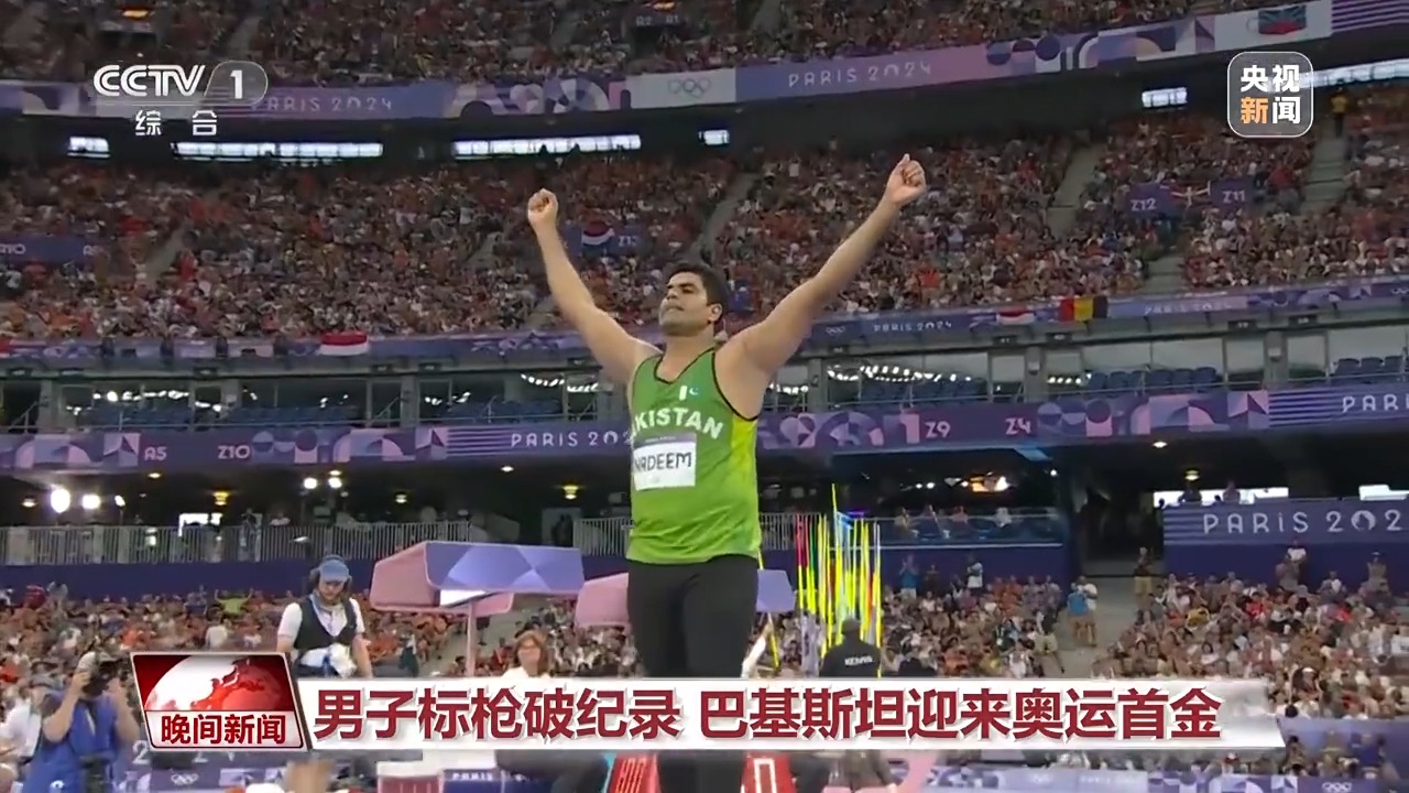 男子標槍決賽中,巴基斯坦選手納迪姆在第二投投出92米97,將原先90米57的奧運會紀錄提高了兩米多。最終,他憑借這一成績拿到金牌,這也是巴基斯坦在本屆奧運會上獲得的首枚獎牌。