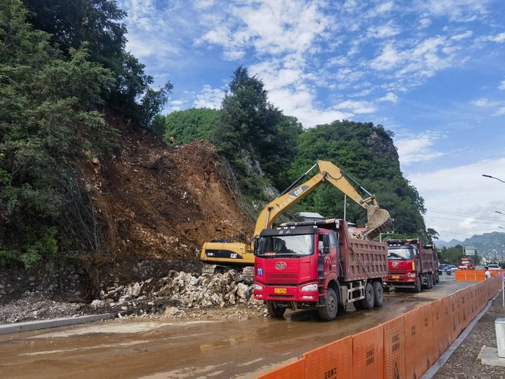 8月6日早7點(diǎn)10分左右,下解放村山上的巨石終于緩緩滑落到路面上。危險(xiǎn)解除了,壓在干部群眾心頭的“巨石”,也終于落了地!