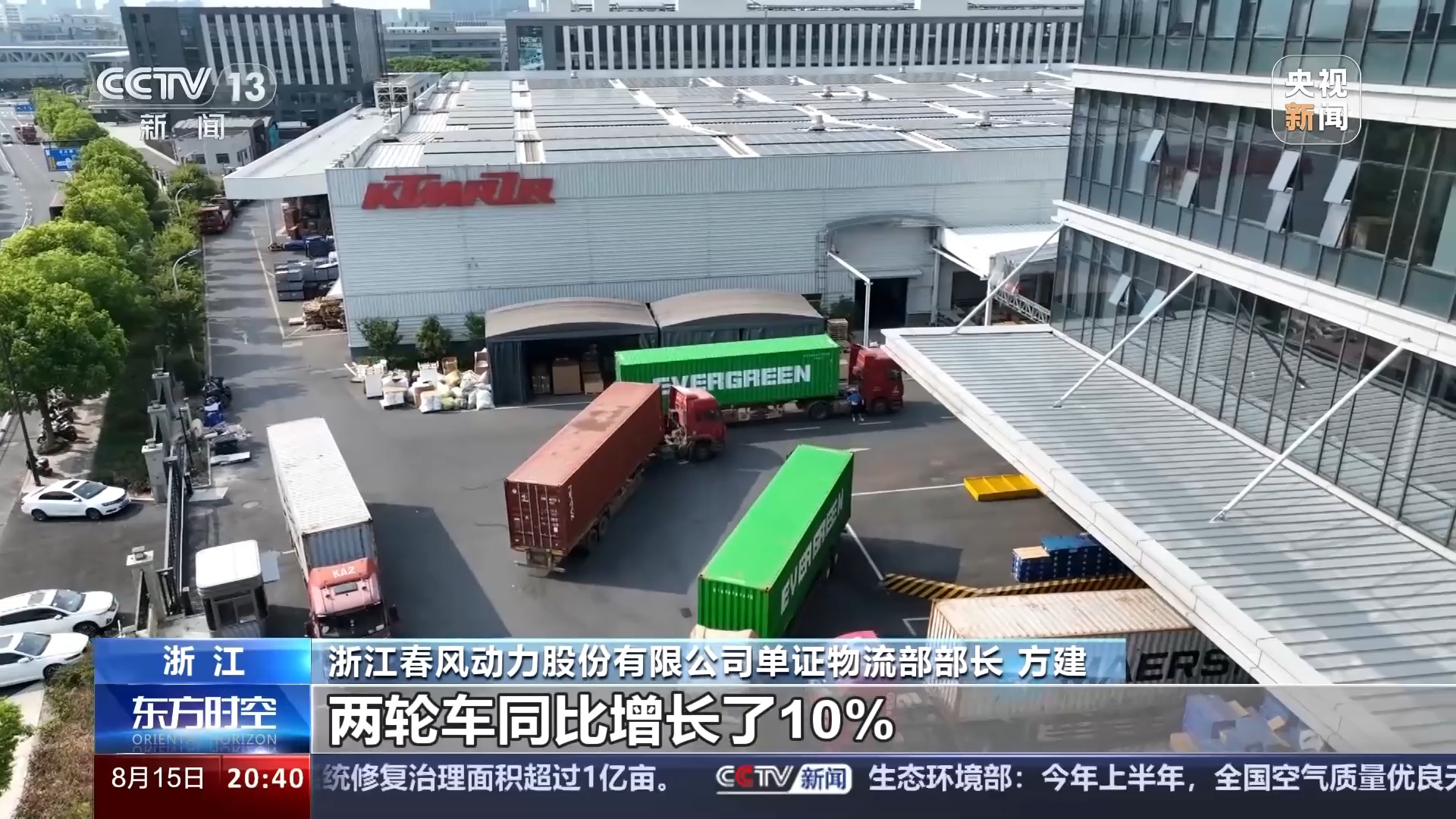 浙江春風(fēng)動(dòng)力股份有限公司單證物流部部長 方建:上半年我們出口四輪車同比增長了40%,兩輪車同比增長了10%,然后集裝箱大概出運(yùn)了7700個(gè)大柜,同比增長了27%。