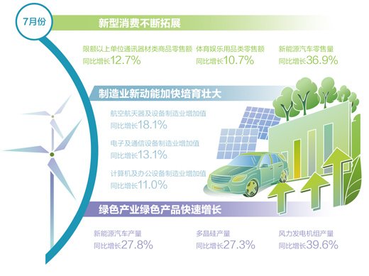 綠色產(chǎn)業(yè)綠色產(chǎn)品快速增長(zhǎng)。7月份,新能源汽車(chē)產(chǎn)量同比增長(zhǎng)27.8%,多晶硅產(chǎn)量同比增長(zhǎng)27.3%、風(fēng)力發(fā)電機(jī)組產(chǎn)量同比增長(zhǎng)39.6%。