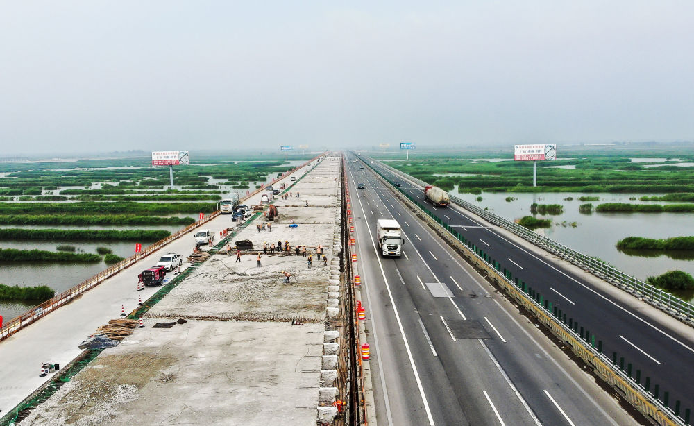 2024年7月4日,在京哈高速公路遼寧段改擴建工程項目施工現(xiàn)場,中鐵四局建設(shè)者進行橋面施工作業(yè)(無人機照片)。新華社記者 楊青 攝