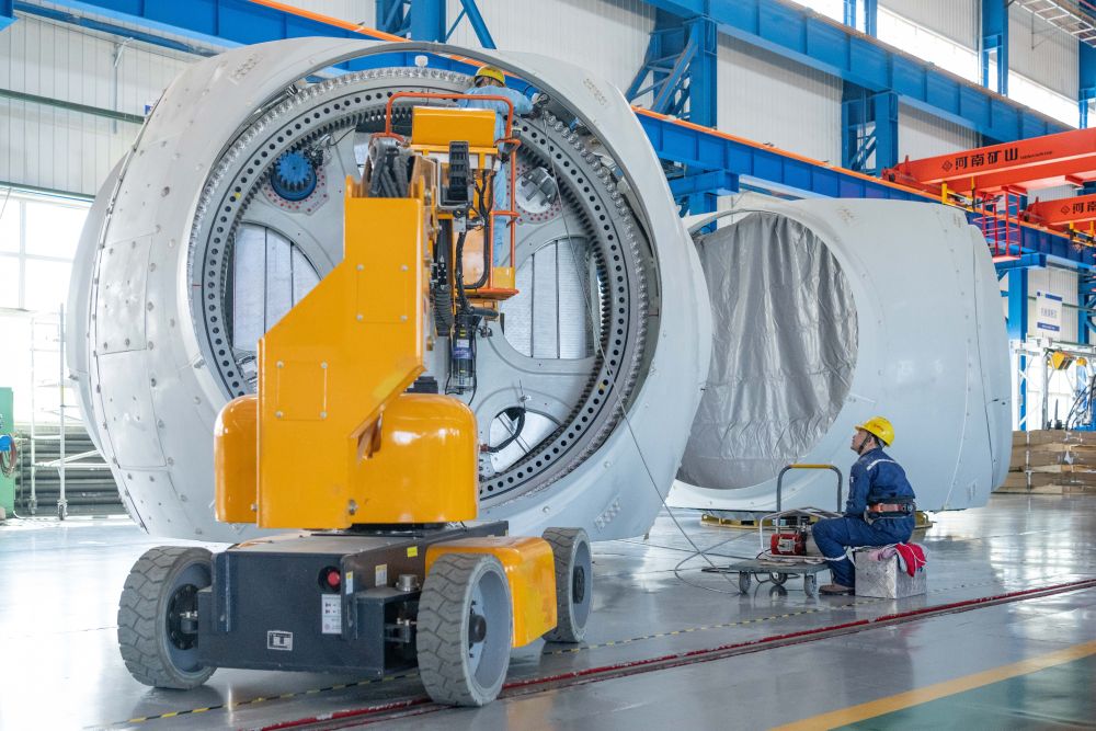2024年4月28日,工人在位于黑龍江省齊齊哈爾市的中國一重集團有限公司風電設(shè)備裝配車間加工風電輪轂。新華社記者 謝劍飛 攝