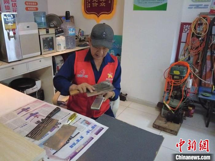 日前,“鑄牢共同體 中華一家親”主題宣傳“塞上江南寫新篇”集中采訪團走進寧夏銀川市金鳳區(qū)黃河?xùn)|路街道的頤和城府社區(qū)。圖為智福德正在為社區(qū)居民打磨刀具。中新網(wǎng)記者 劉玥晴 攝
