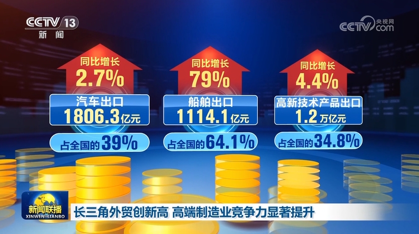 海關(guān)最新數(shù)據(jù)顯示,今年前7個(gè)月,長(zhǎng)三角地區(qū)進(jìn)出口規(guī)模創(chuàng)歷史新高,汽車(chē)、船舶、數(shù)控機(jī)床等產(chǎn)品出口亮眼,長(zhǎng)三角地區(qū)高端制造業(yè)國(guó)際競(jìng)爭(zhēng)力加速提升。