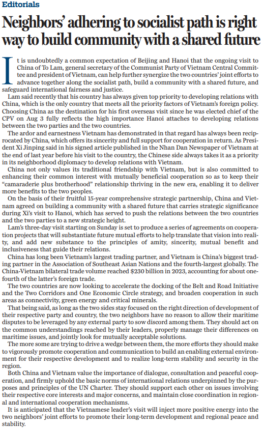 此次訪華是蘇林自8月3日當(dāng)選越共中央總書記以來的首次外訪,彰顯了越方對發(fā)展兩黨兩國關(guān)系的高度重視。對于越方展現(xiàn)出的熱情與誠意,中方給與積極回應(yīng),全力支持雙方合作。
