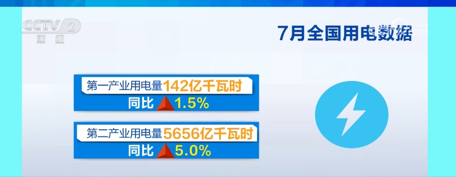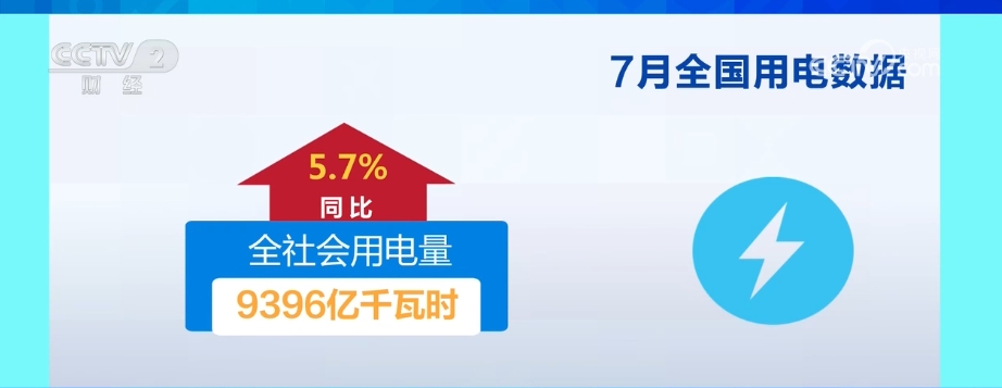入夏以來,全國多地出現(xiàn)持續(xù)性高溫天氣,最大用電負荷快速攀升,電力供應保障有力有效。7月份,全社會用電量9396億千瓦時,同比增長5.7%。從分產(chǎn)業(yè)用電看,第一產(chǎn)業(yè)用電量142億千瓦時,同比增長1.5%;第二產(chǎn)業(yè)用電量5656億千瓦時,同比增長5.0%;第三產(chǎn)業(yè)用電量1871億千瓦時,同比增長7.8%;城鄉(xiāng)居民生活用電量1727億千瓦時,同比增長5.9%。