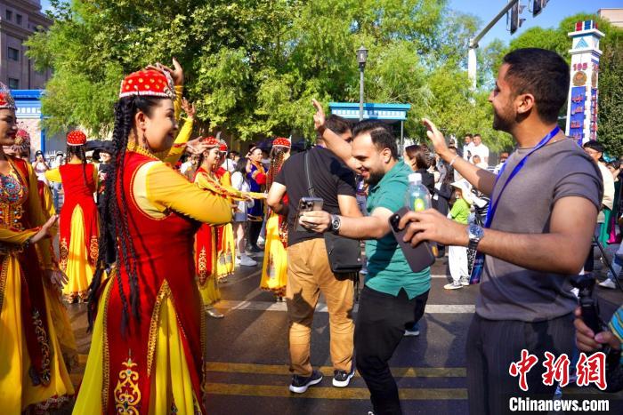 22日,民族風(fēng)情街上,巴基斯坦媒體人與當(dāng)?shù)鼐S吾爾族居民一起跳起維吾爾族舞蹈。陳欣怡 攝