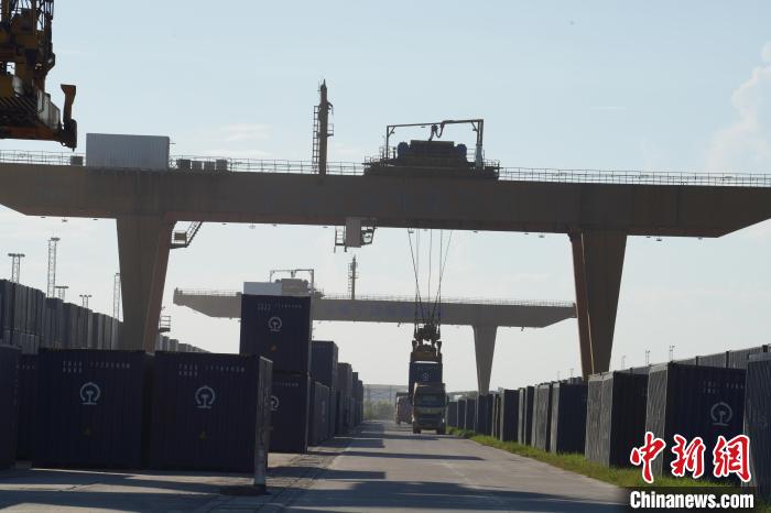 圖為龍門吊正將集裝箱從卡車轉(zhuǎn)移至中越貨運班列。 王以照 攝