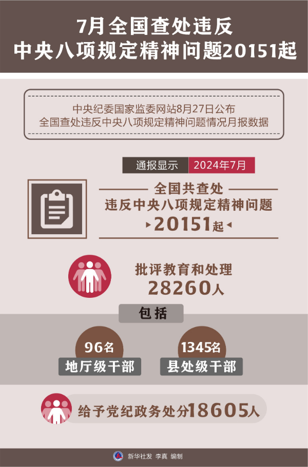 中央紀委國家監(jiān)委網(wǎng)站27日公布全國查處違反中央八項規(guī)定精神問題情況月報數(shù)據(jù)。通報顯示,今年7月,全國共查處違反中央八項規(guī)定精神問題20151起,批評教育和處理28260人(包括96名地廳級干部、1345名縣處級干部),給予黨紀政務處分18605人。
