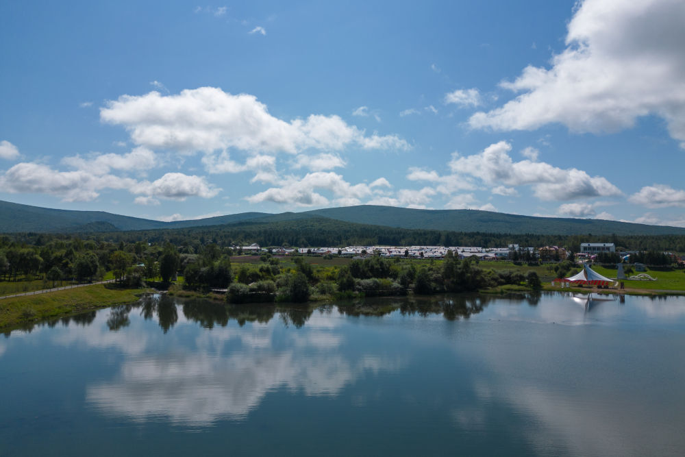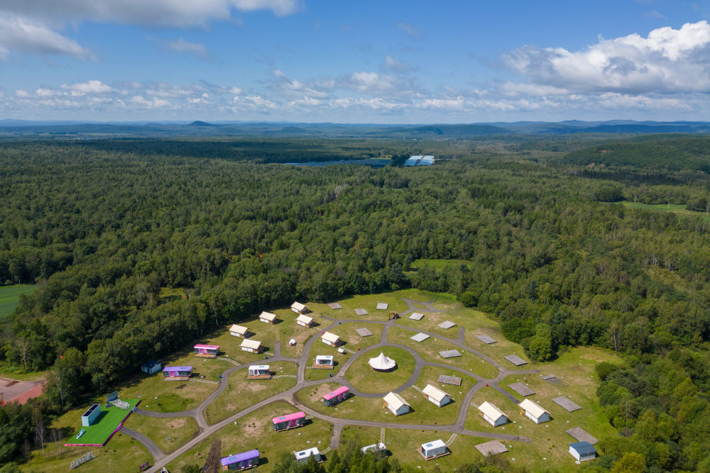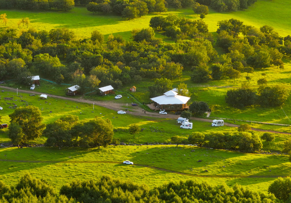 這是8月27日拍攝的黑龍江伊春森工集團(tuán)上甘嶺林業(yè)局公司溪水林場(chǎng)的溪水野奢帳篷度假酒店項(xiàng)目(無(wú)人機(jī)照片)。