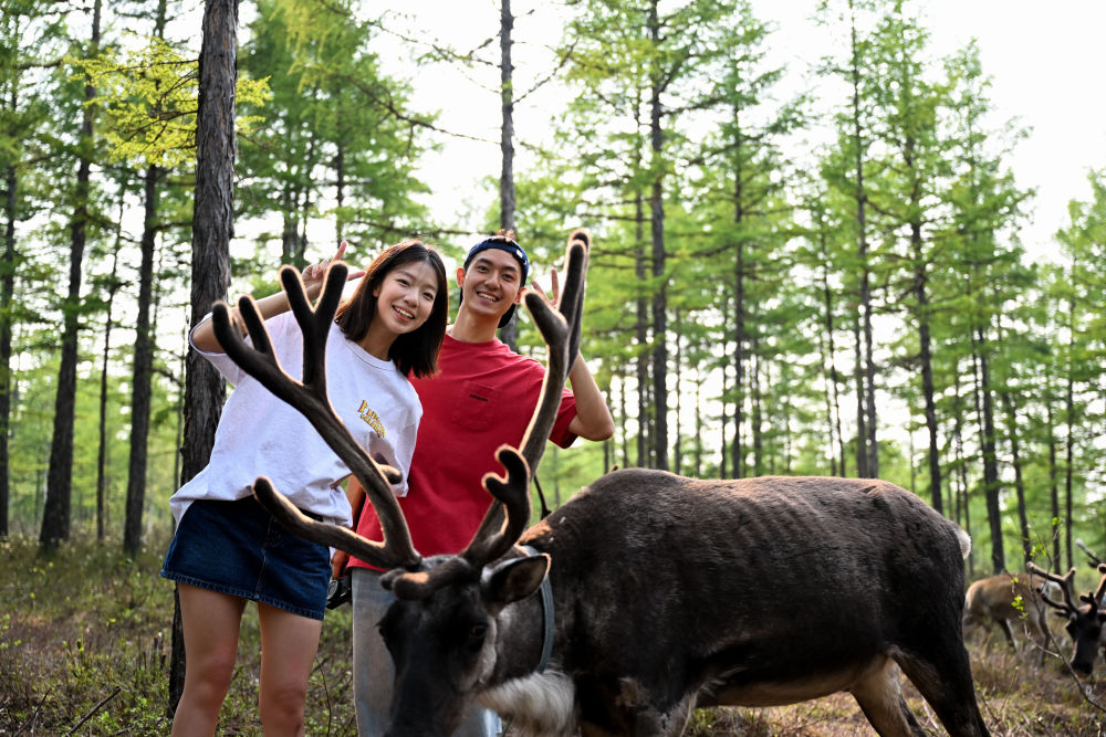 7月3日,游客在內(nèi)蒙古呼倫貝爾市根河市阿尤莎馴鹿放養(yǎng)點(diǎn)游玩。