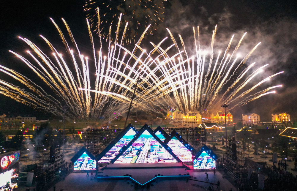 在內(nèi)蒙古興安盟阿爾山市拍攝的2023年中國(guó)(阿爾山)旅游大會(huì)開(kāi)幕前一晚的焰火表演(2023年9月1日攝,無(wú)人機(jī)照片)。