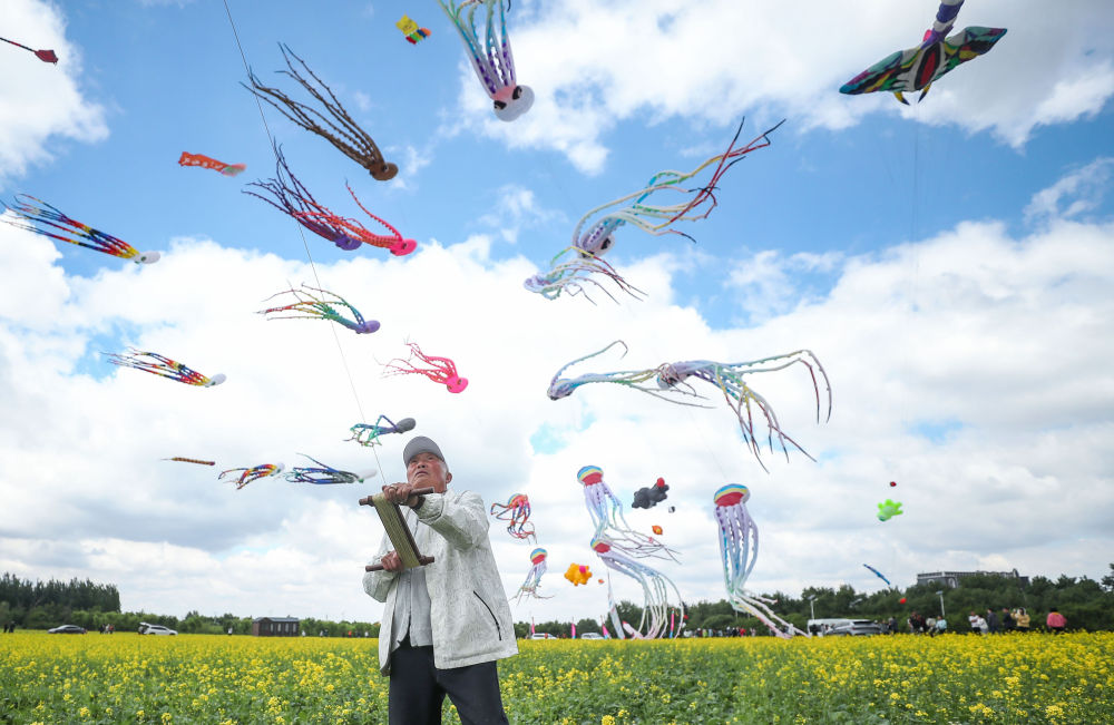 在遼寧省康平縣,一名風(fēng)箏愛(ài)好者在風(fēng)箏節(jié)活動(dòng)現(xiàn)場(chǎng)放風(fēng)箏(5月31日攝)。