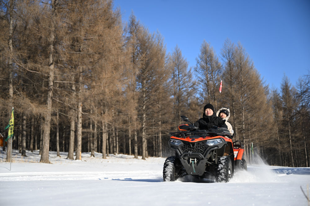 游客在內(nèi)蒙古興安盟阿爾山市駕駛雪地摩托游玩(2023年12月14日攝)。