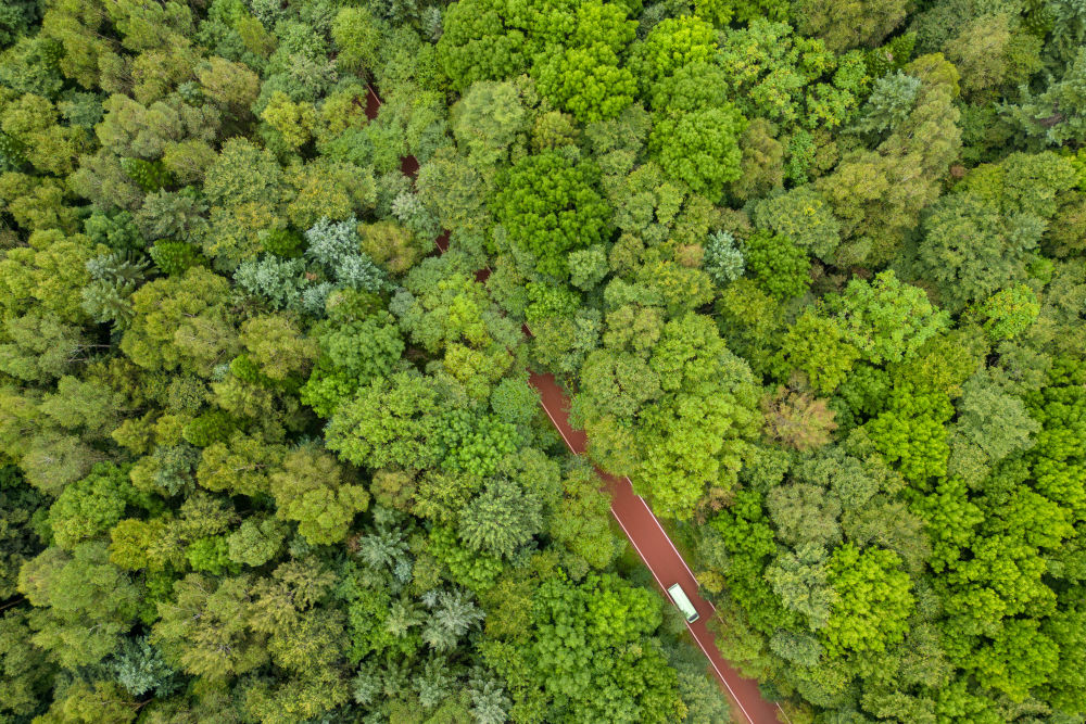 8月27日,游客乘坐電瓶車(chē)在黑龍江伊春市上甘嶺溪水國(guó)家森林公園內(nèi)穿行(無(wú)人機(jī)照片)。