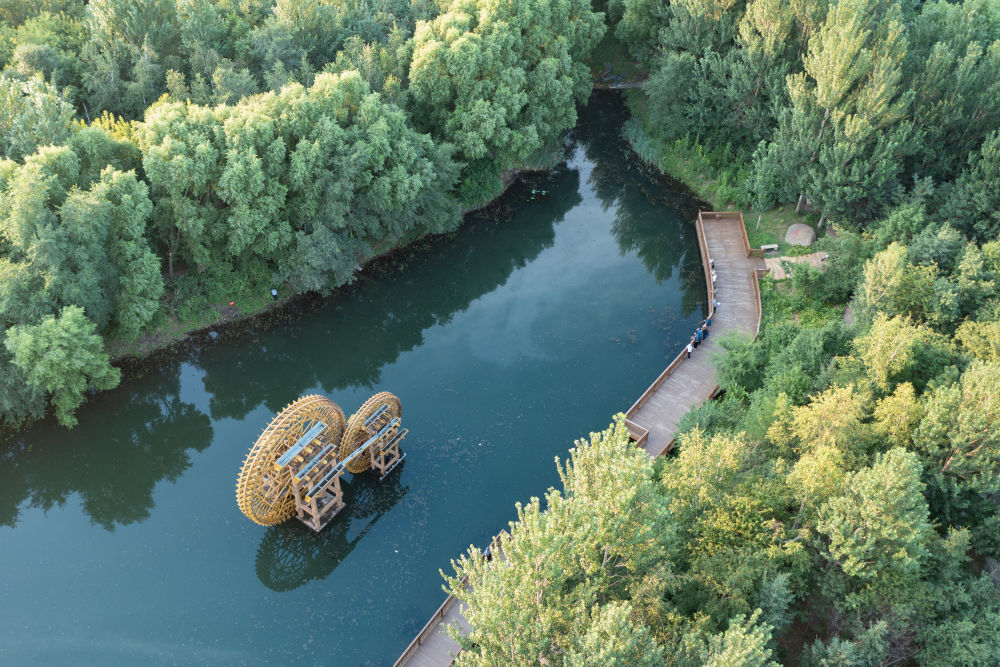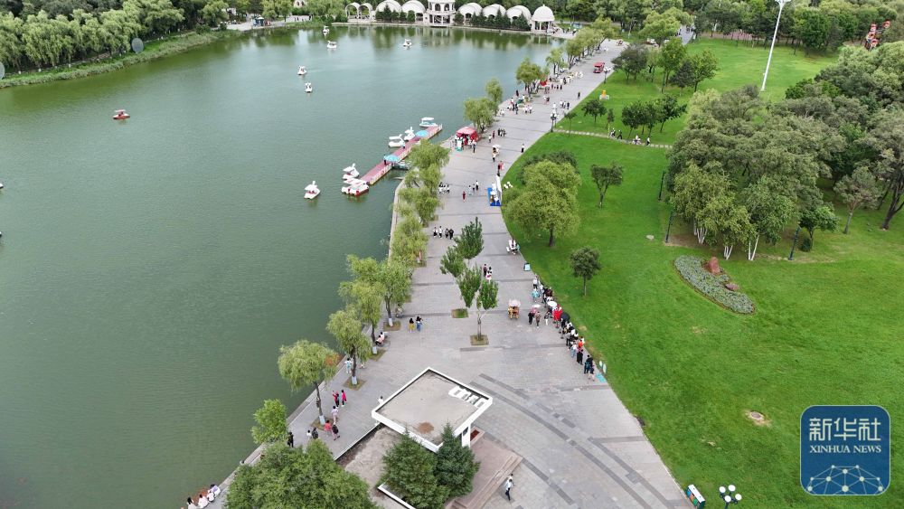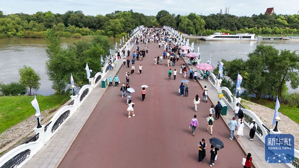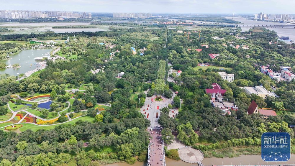 人們?cè)邶埥ぜ瘓F(tuán)綏棱林業(yè)局生態(tài)文化旅游景區(qū)一處公園游覽(7月25日攝,無(wú)人機(jī)照片)。
