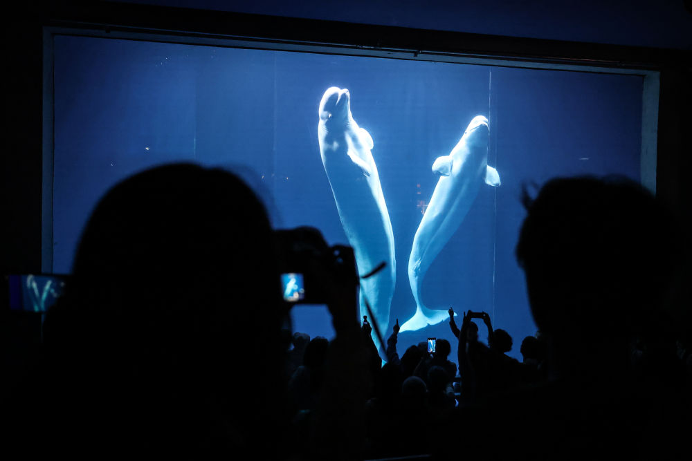 游客在大連圣亞海洋世界觀賞白鯨(5月22日攝)。