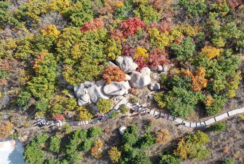 游客在遼寧阜新的海棠山游覽(2023年10月19日攝,無(wú)人機(jī)照片)。