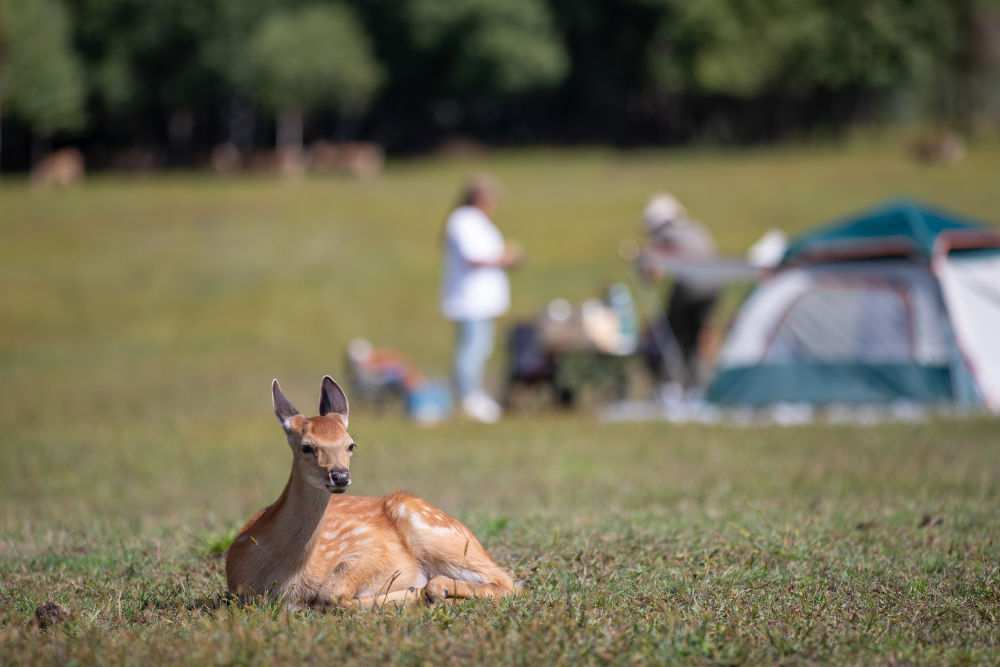 8月27日,在黑龍江伊春市上甘嶺溪水國(guó)家森林公園鹿溪牧場(chǎng),一只鹿在草坪上休息。