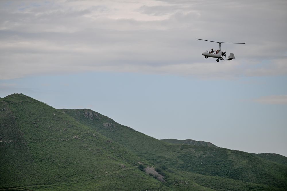 8月8日,游客在內(nèi)蒙古興安盟科爾沁右翼前旗烏蘭毛都草原乘旋翼機(jī)游玩。
