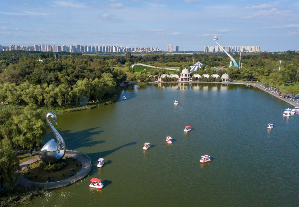 8月20日,游客在黑龍江哈爾濱太陽(yáng)島風(fēng)景區(qū)太陽(yáng)湖上乘船游覽(無(wú)人機(jī)照片)。