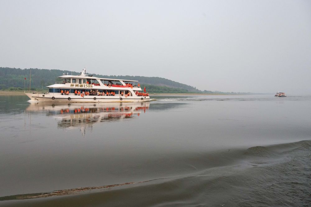 游客從黑龍江省漠河市北極村景區(qū)上船,乘船在黑龍江上觀光游玩(7月2日攝)。