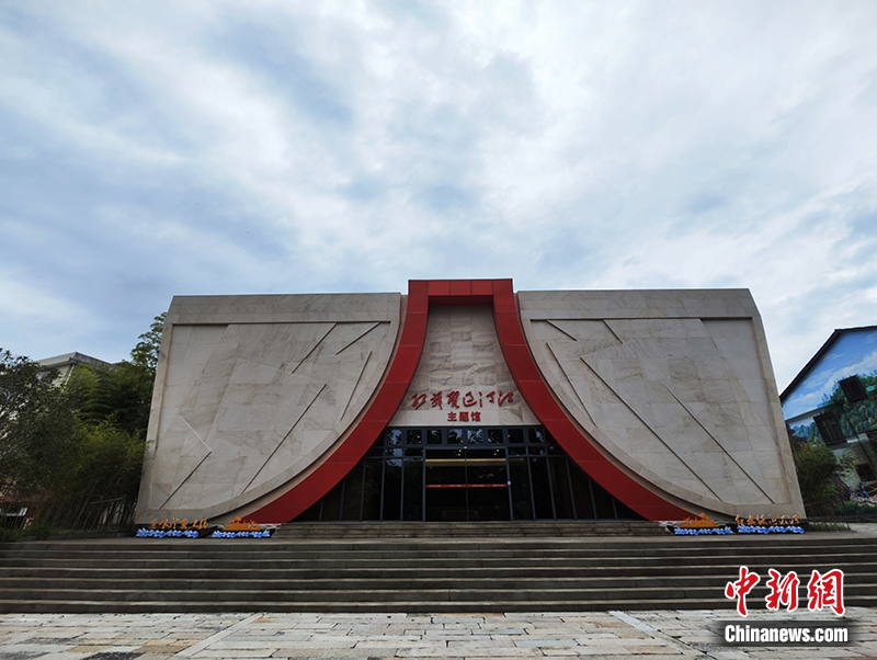 在當(dāng)年擺渡人們行舟悠游來(lái)去的渡口旁,一棟造型奇特的建筑映入采訪團(tuán)的眼簾——展館整體結(jié)構(gòu)形如“四”字,寓意“紅四軍”,中間紅色砌磚組成“八一”字樣,九面旗幟浮雕象征九條船載著紅軍渡江。