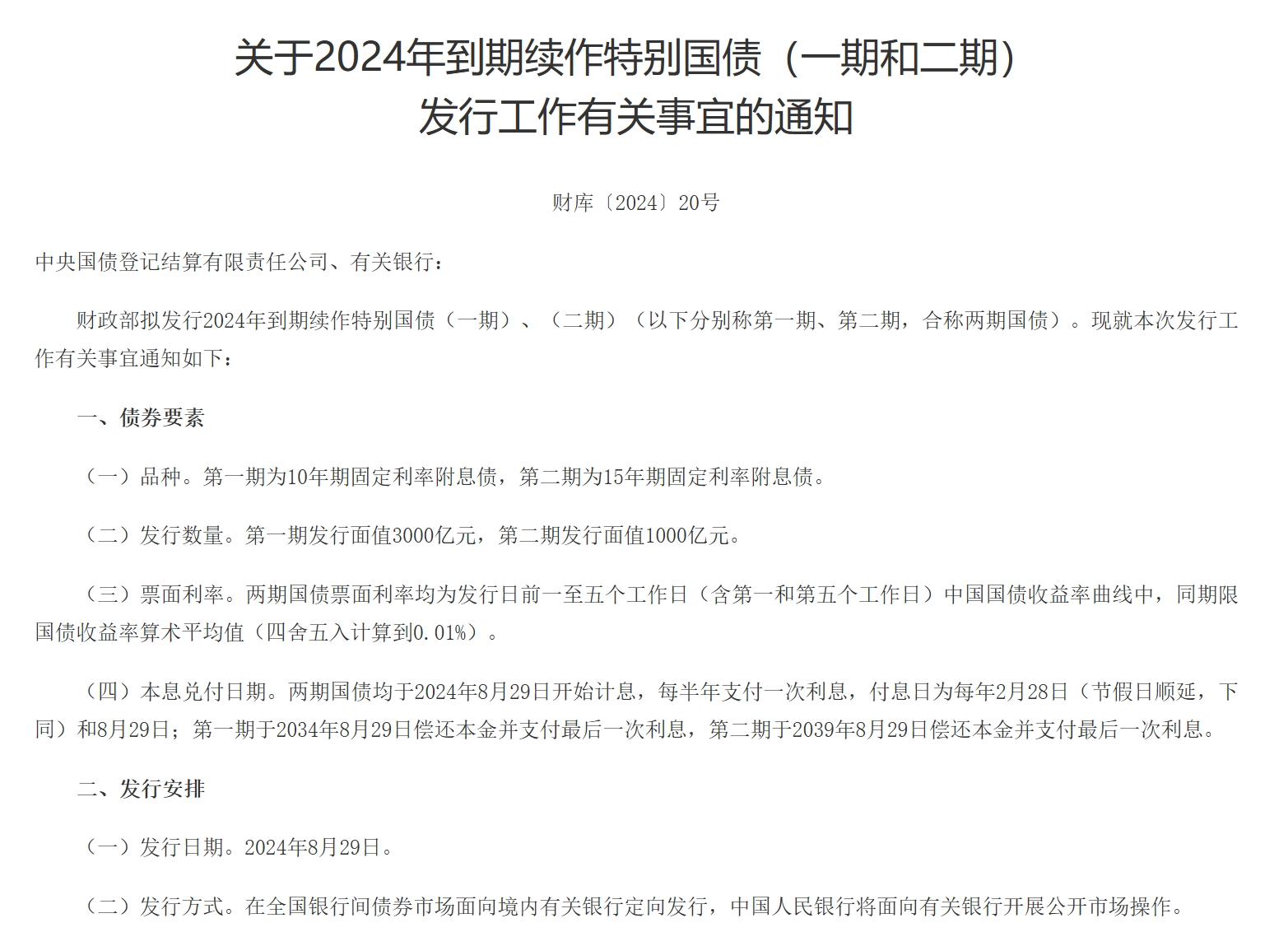 8月19日,財(cái)政部發(fā)布關(guān)于2024年到期續(xù)作特別國(guó)債發(fā)行工作有關(guān)事宜的通知。財(cái)政部擬發(fā)行2024年到期續(xù)作特別國(guó)債(一期)、(二期)。第一期為10年期固定利率附息債,第二期為15年期固定利率附息債。第一期發(fā)行面值3000億元,第二期發(fā)行面值1000億元。兩期國(guó)債票面利率均為發(fā)行日前一至五個(gè)工作日(含第一和第五個(gè)工作日)中國(guó)國(guó)債收益率曲線(xiàn)中,同期限國(guó)債收益率算術(shù)平均值(四舍五入計(jì)算到0.01%)。發(fā)行日期為2024年8月29日,在全國(guó)銀行間債券市場(chǎng)面向境內(nèi)有關(guān)銀行定向發(fā)行,中國(guó)人民銀行將面向有關(guān)銀行開(kāi)展公開(kāi)市場(chǎng)操作。