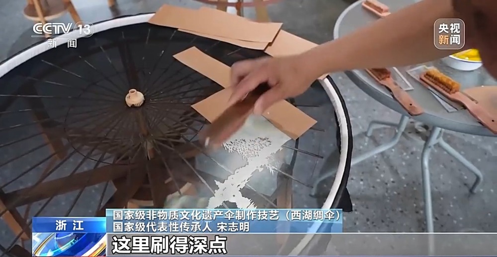 一個(gè)小時(shí)后,一幅由刷花工藝?yán)L成的三潭印月圖案躍然傘面之上,西湖風(fēng)景與杭州絲綢通過刷花這一手工技藝,完美地融合在了一起。