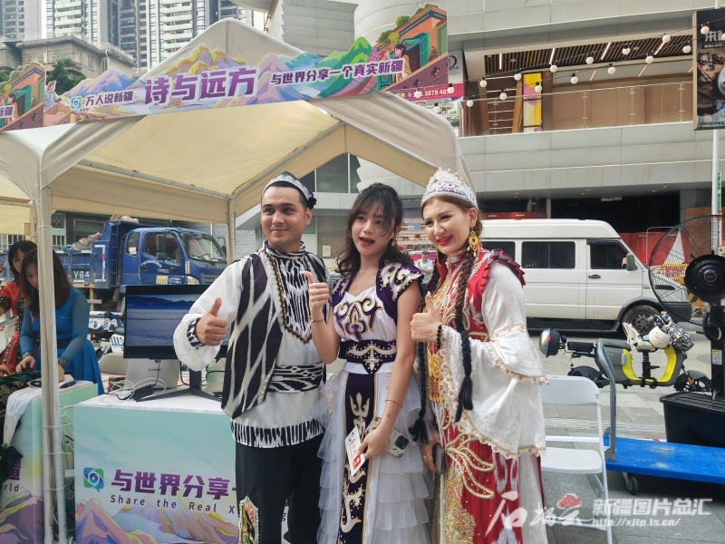 9月2日,“萬人說新疆”走進(jìn)廣東分享會(huì)之新疆特色文化主題“大巴扎”在廣州市越秀區(qū)289藝術(shù)創(chuàng)意園區(qū)北廣場(chǎng)舉行。廣州市民陳婕(中)穿著新疆民族服飾與舞蹈演員合影留念。石榴云/新疆日?qǐng)?bào)記者 甘興華攝