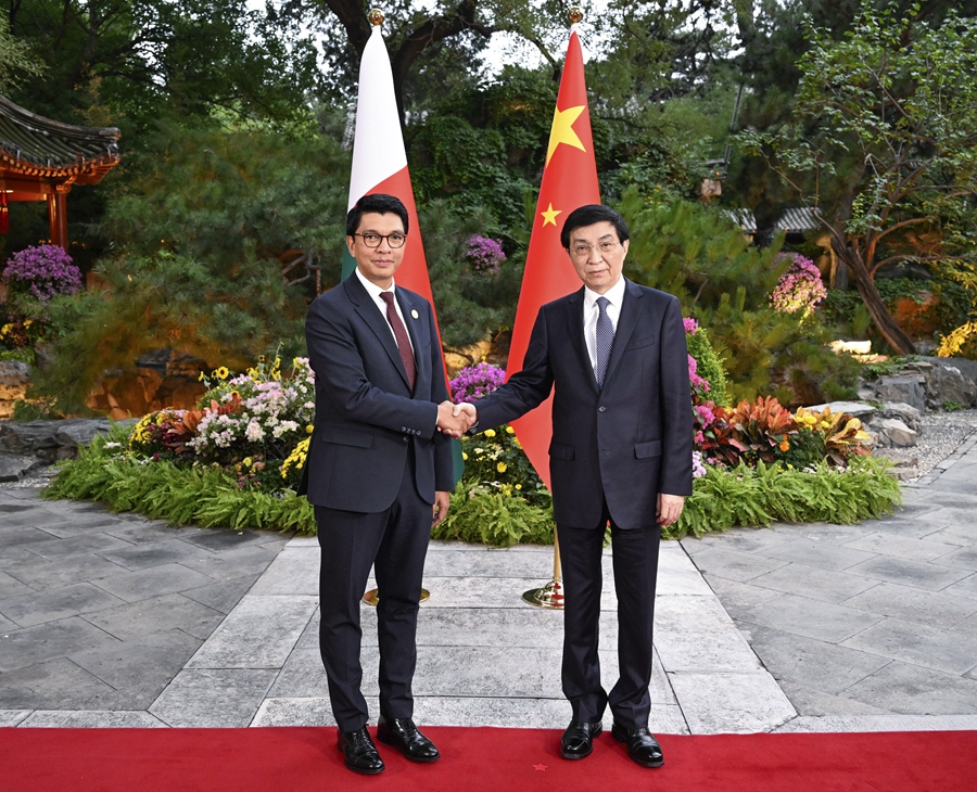 9月6日,全國(guó)政協(xié)主席王滬寧在北京會(huì)見來華出席中非合作論壇北京峰會(huì)的馬達(dá)加斯加總統(tǒng)拉喬利納。新華社記者 申宏 攝