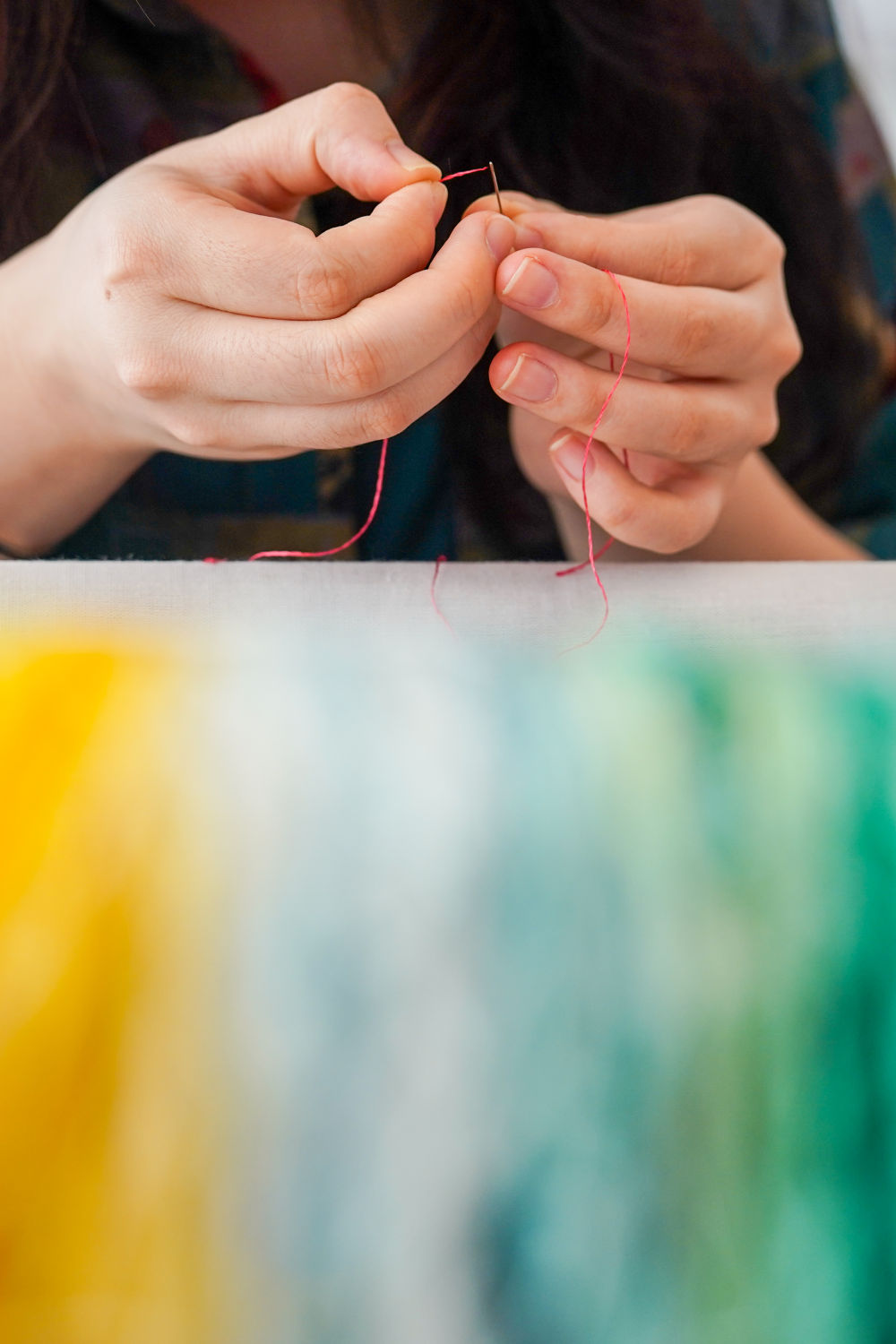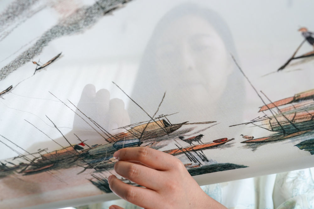 在蘇州高新區(qū)蘇繡小鎮(zhèn)的一家蘇繡公司,一位繡娘在穿針,準(zhǔn)備加工蘇繡產(chǎn)品(7月3日攝)。