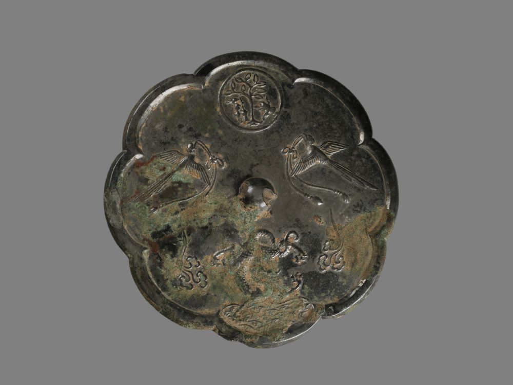 這枚雙鸞月宮紋葵花形鏡為國家二級(jí)文物,直徑15.3厘米,重0.54千克,1983年出土于陜西省東南部地區(qū)。陜西歷史博物館社會(huì)教育部主任、研究館員呼嘯說:“這枚銅鏡不過手掌大小,其畫面卻紋飾細(xì)膩、層次豐富?!?/p>