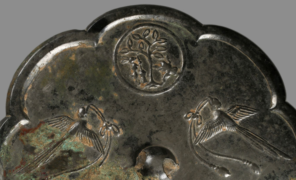 畫面中部鏡鈕兩側(cè),是兩只口銜綬帶的鳥兒。它們拖著長長的尾羽,雙翅伸展相對(duì)飛舞,口中的綬帶飄逸飛揚(yáng)。在它們的目光交匯處,是這組畫面的主題:月宮。