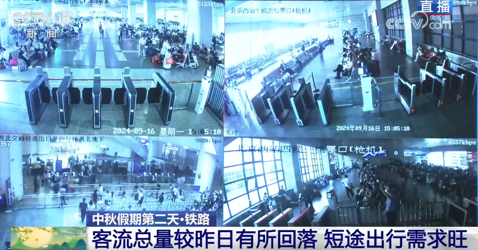 9月16日是中秋假期的第二天,哪些地方是大家的熱門出游地?先來看看鐵路出行。16日,鐵路出行客流以短途探親客流為主,預(yù)計(jì)發(fā)送旅客1180萬人次。16日鐵路短途出行需求旺盛,詳細(xì)情況,我們馬上連線正在國鐵集團(tuán)運(yùn)輸調(diào)度指揮大廳采訪的總臺(tái)央視記者楊麗君。