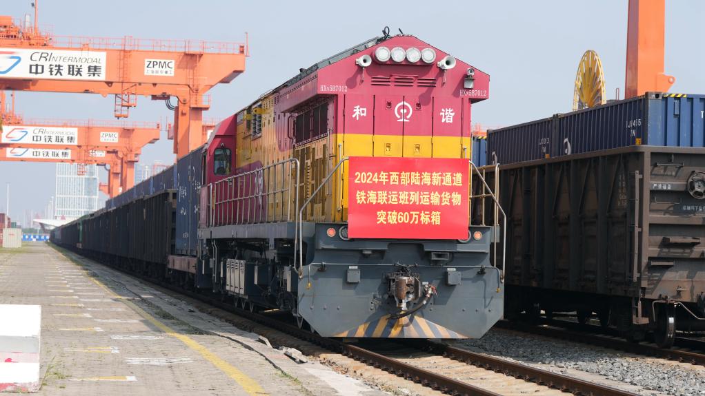 2024年9月14日,一列帶有突破60萬標(biāo)箱標(biāo)志的鐵海聯(lián)運(yùn)班列準(zhǔn)備從欽州鐵路集裝箱中心站駛出。新華社記者 張愛林 攝