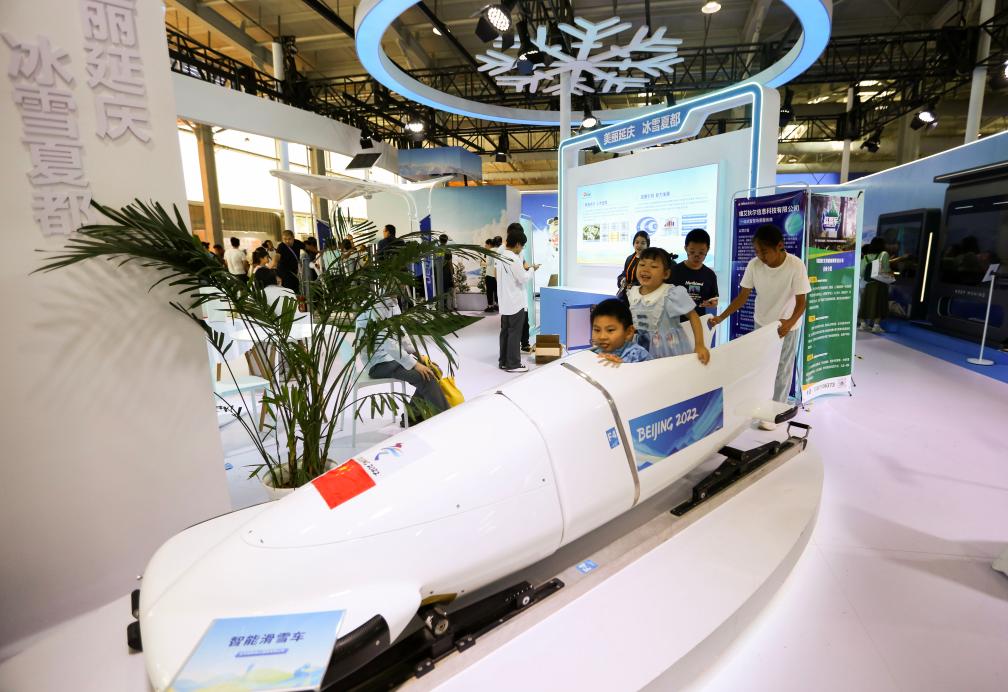 9月16日,在服貿(mào)會(huì)首鋼園區(qū),小朋友在“美麗延慶 冰雪夏都”展臺(tái)參觀體驗(yàn)。新華社記者 鄒廣萍 攝