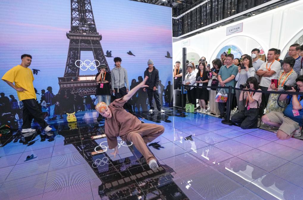 9月14日,在2024年服貿(mào)會(huì)國(guó)家會(huì)議中心綜合展區(qū)的主賓國(guó)法國(guó)展臺(tái),中法兩國(guó)街舞好手在表演霹靂舞。新華社記者 陳曄華 攝